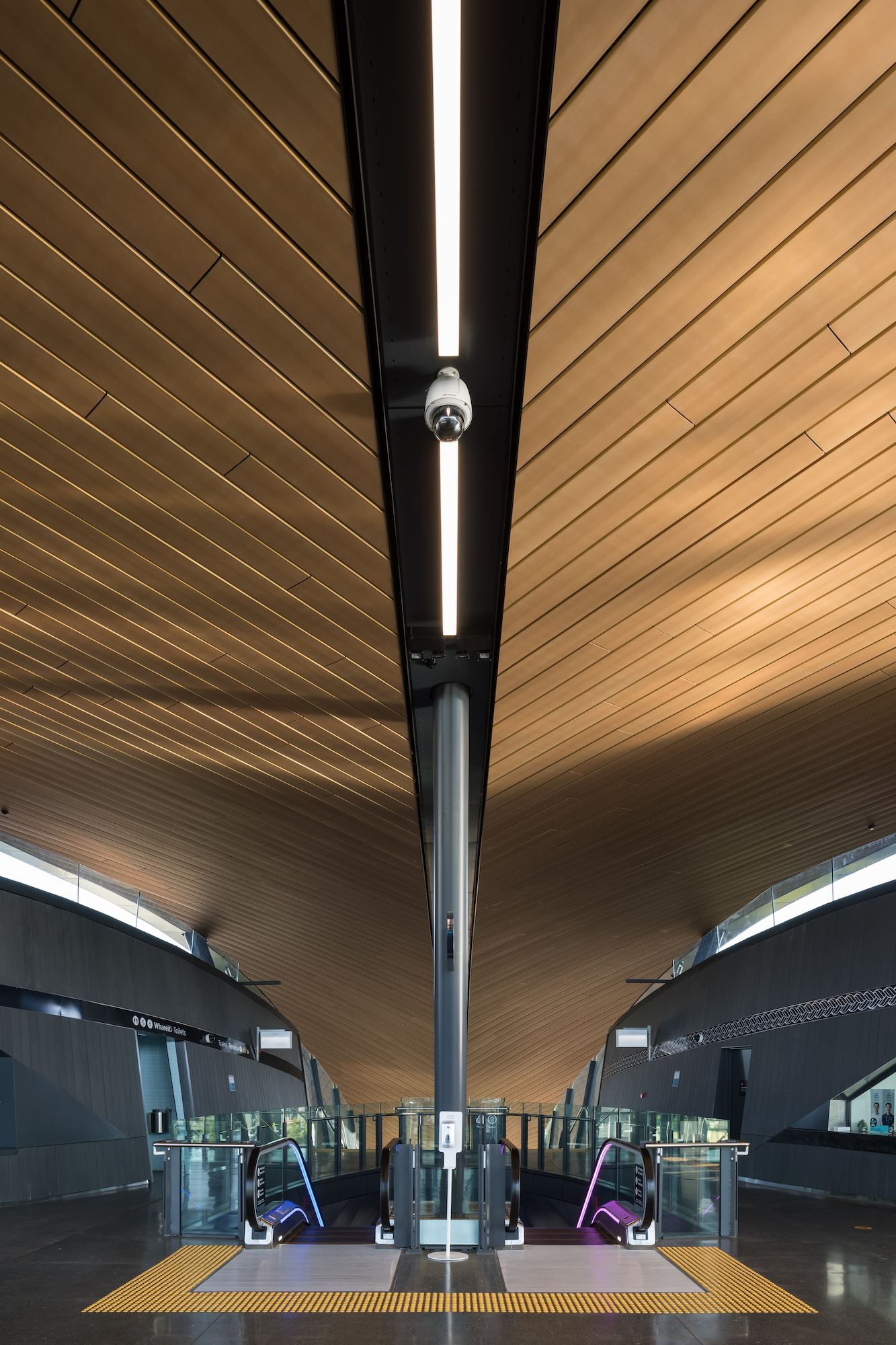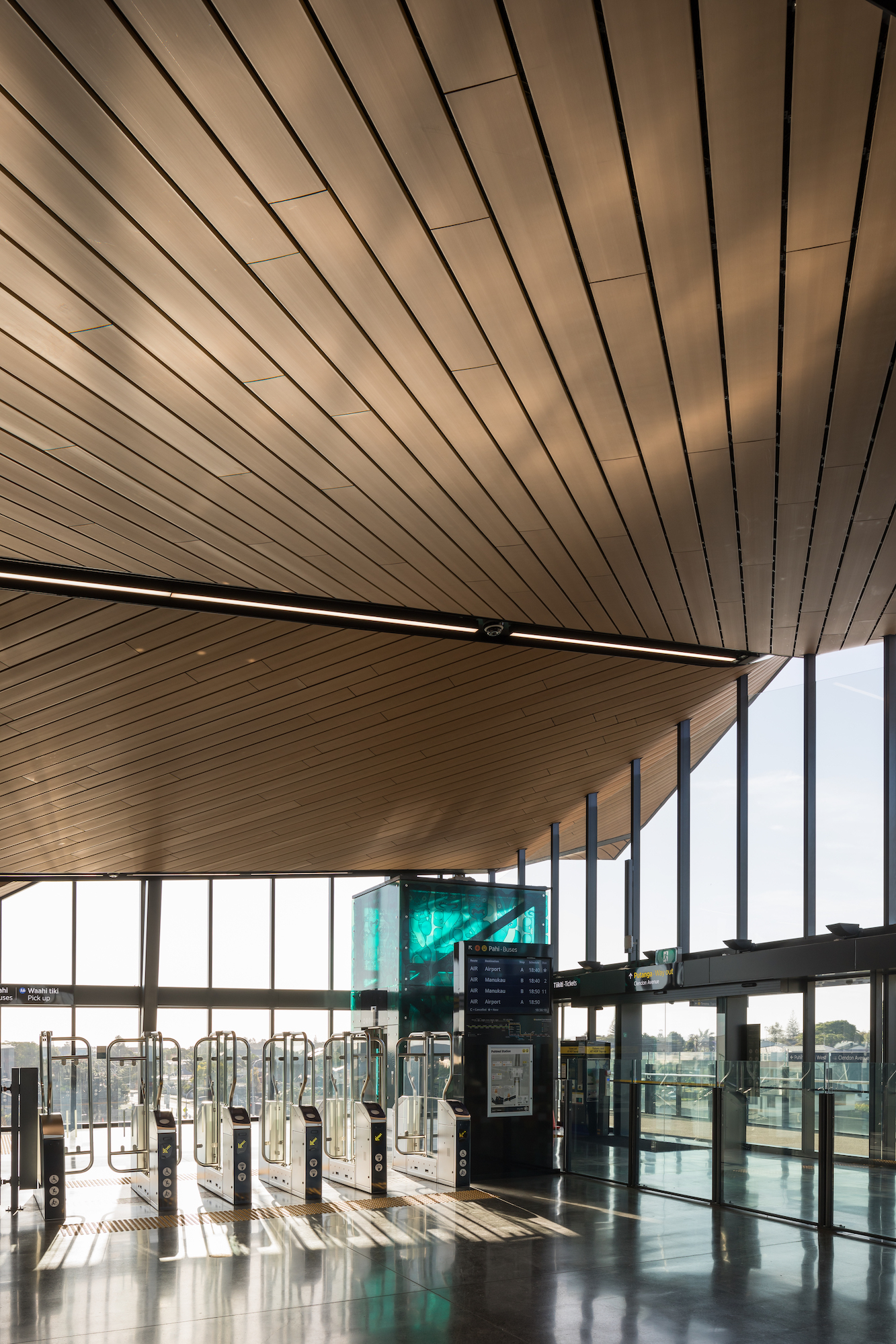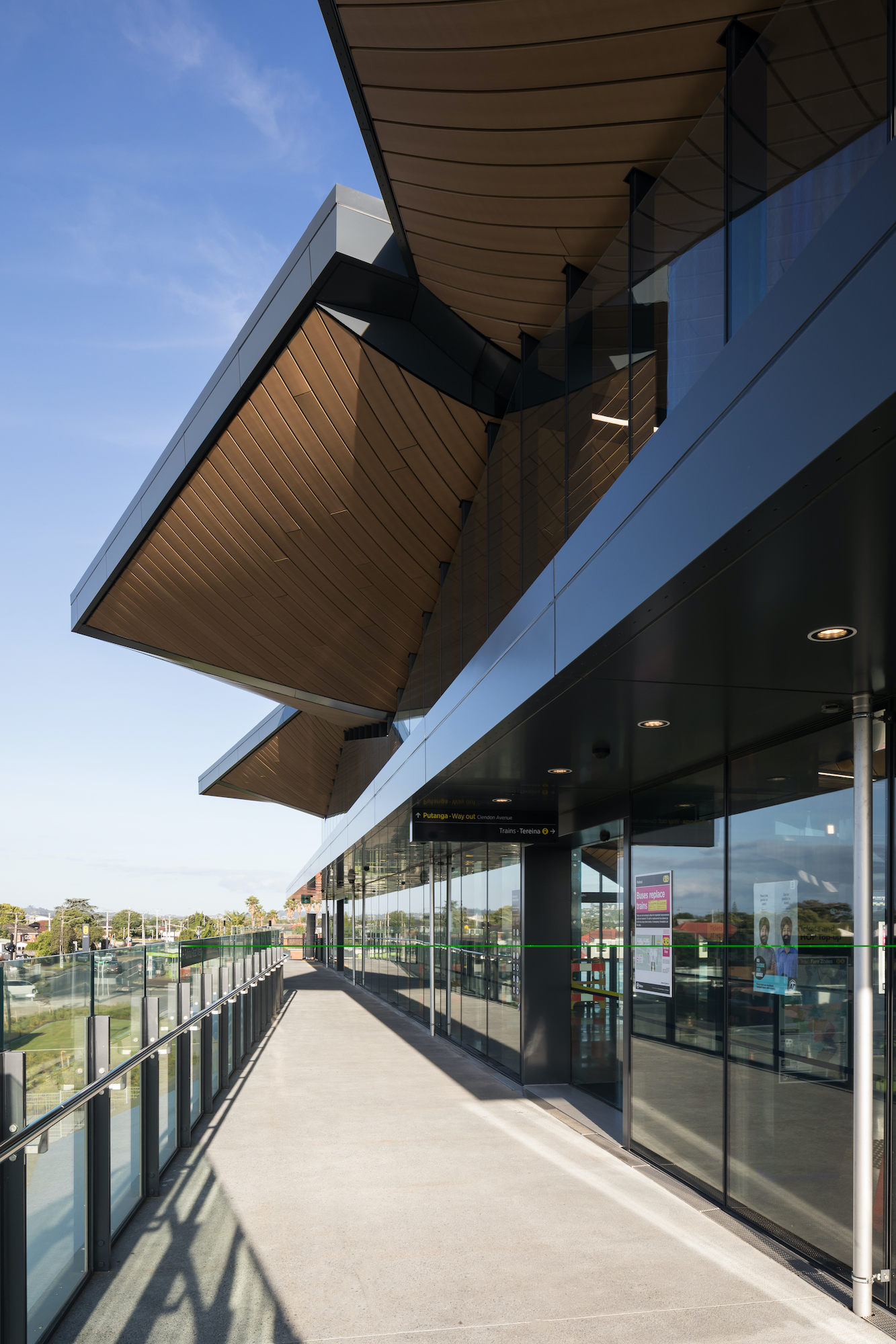 The Puhinui Station Interchange acts as an entry point to the city of Auckland. According to Jasmax, One of the key design aims was to create a distinctive and quality passenger experience. The roof was designed to combine functionality and a key identity element – “a distinctive feather-like form protecting the people who transit beneath it and forming a landmark for the local community”.